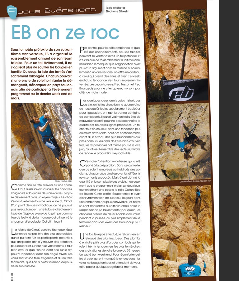 EB on ze roc La marque qui à invente les premiers chaussons de grimpe vient de feter ses 60 ans. Pour l'occasion, les tenors des podiums se sont essayes à quelques horreurs sur une falaise sortie directement du moyen-âge de l'escalade libre.