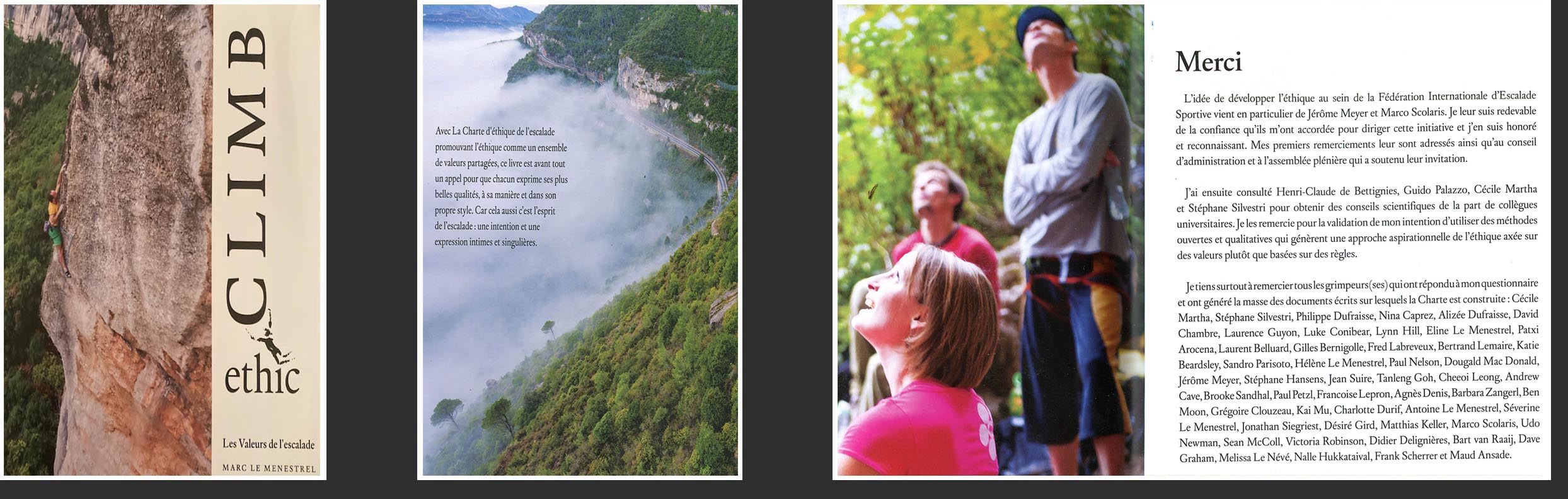 L'immense honneur d'avoir pu partager mon avis, en tant qu'universitaire et surtout en tant que grimpeur, sur la question de l'éthique en escalade pour cette synthèse en l'ouvrage de Marc Le Menestrel.